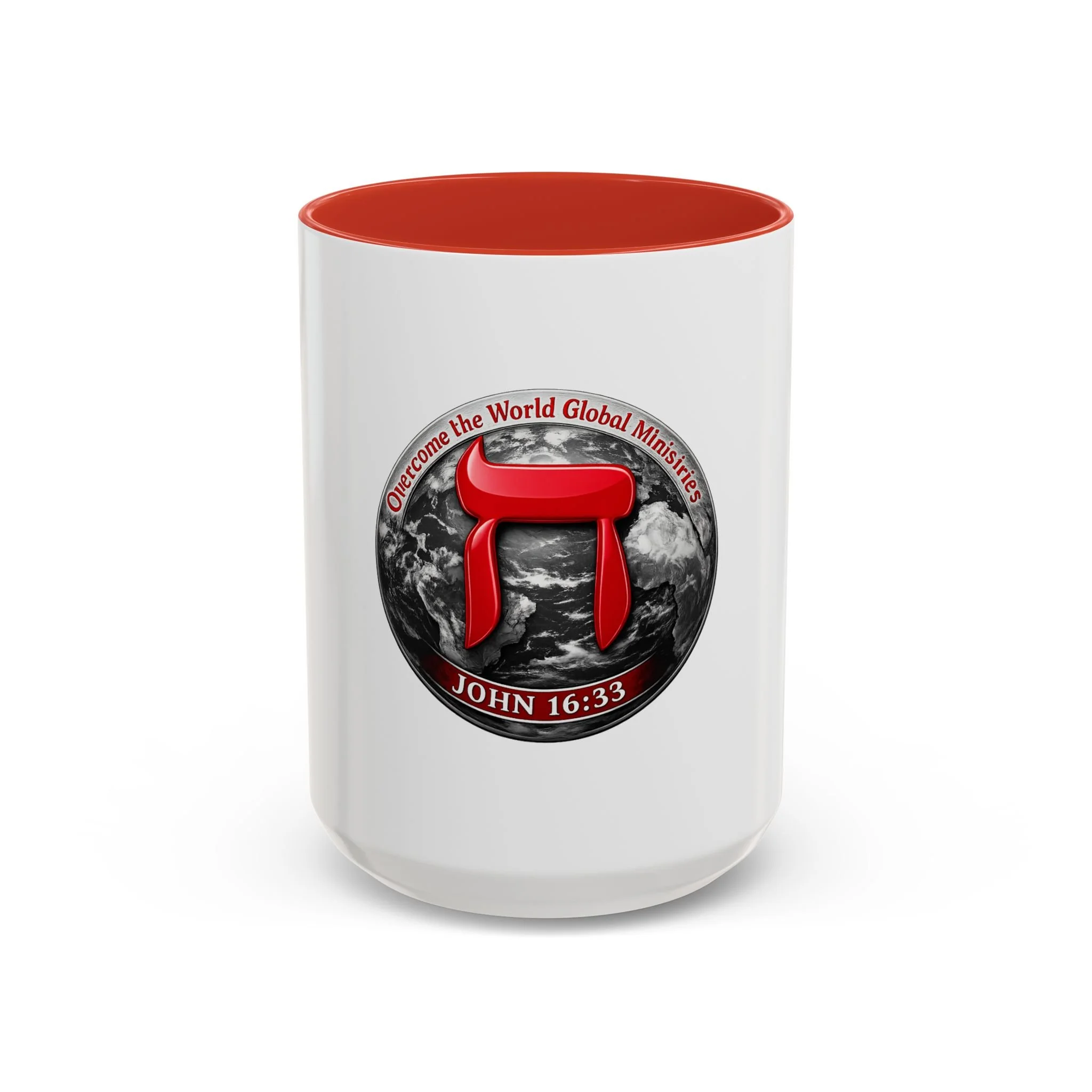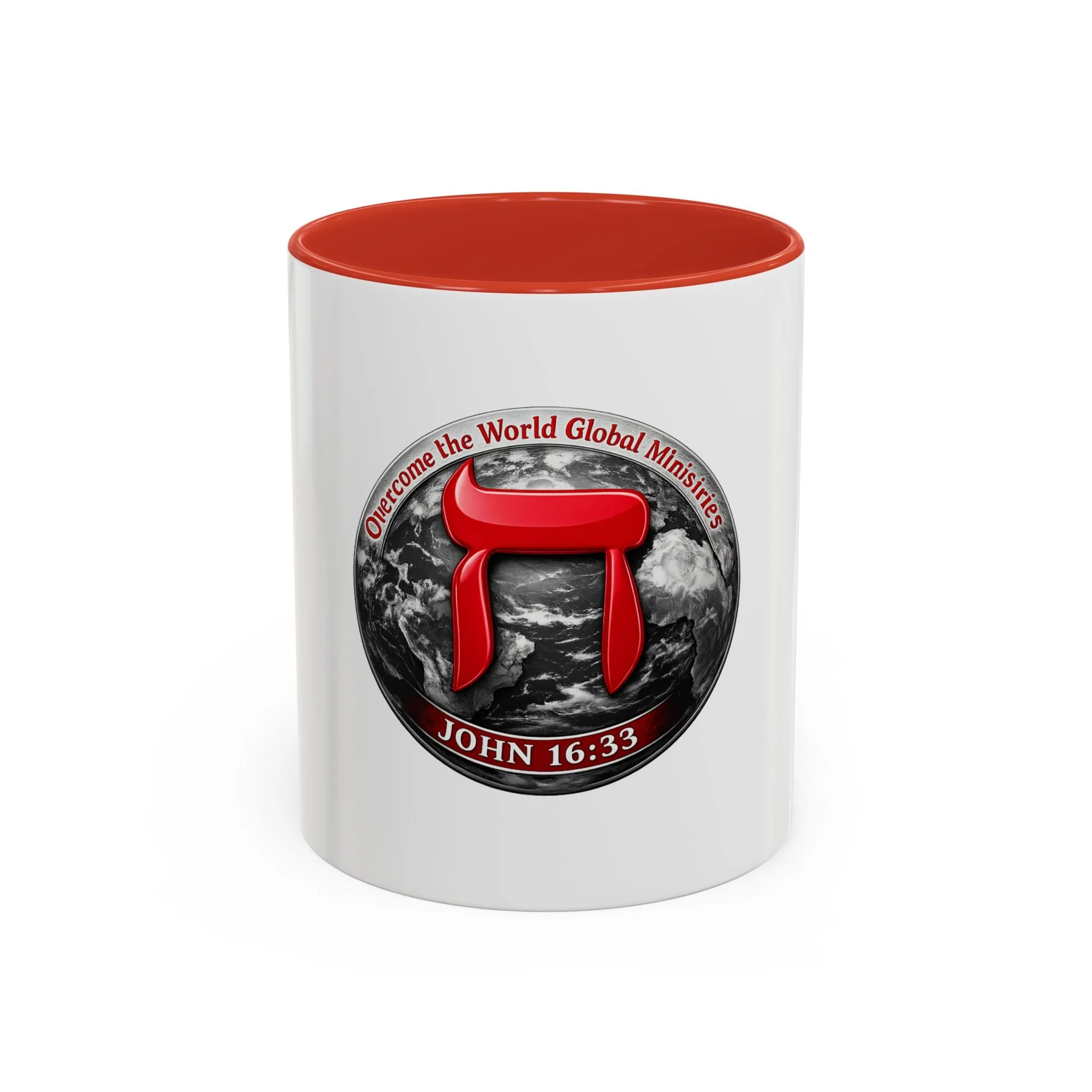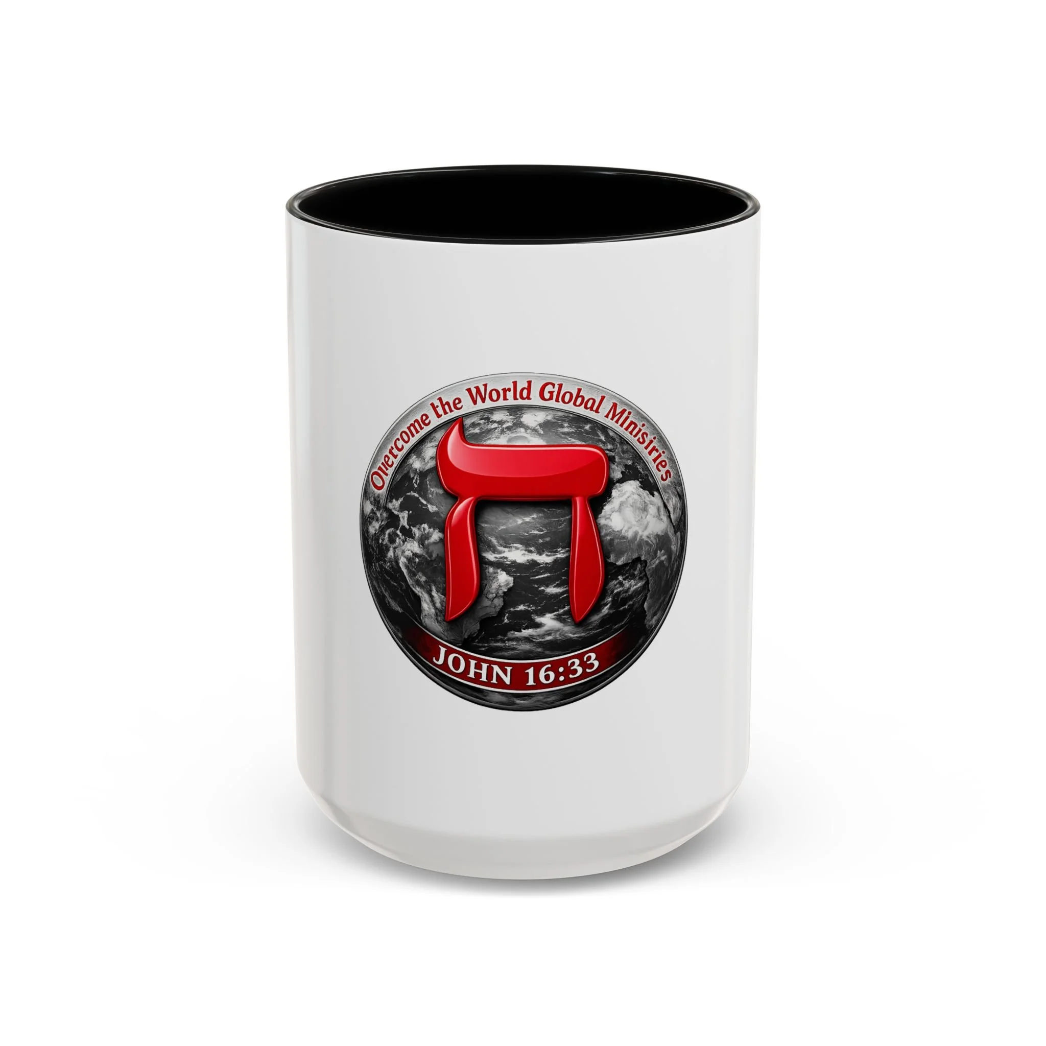 A bold ceramic mug that speaks to conviction and quiet mornings of reflection. The white glossy body contrasts with a rich black interior and handle, framing a striking circular emblem: a red Hebrew character layered over a grayscale globe, with the scripture reference John 16:33 arched beneath. It feels like a morning anchor — the kind of cup you reach for while reading devotionals, planning outreach, or pausing to steady your breath before a busy day. The vibrant print keeps the emblem sharp, and the sturdy C-handle sits comfortably in hand as you sip coffee or tea. Durable enough for daily use, it stands up to the microwave and dishwasher so the message stays part of your routine without fuss.