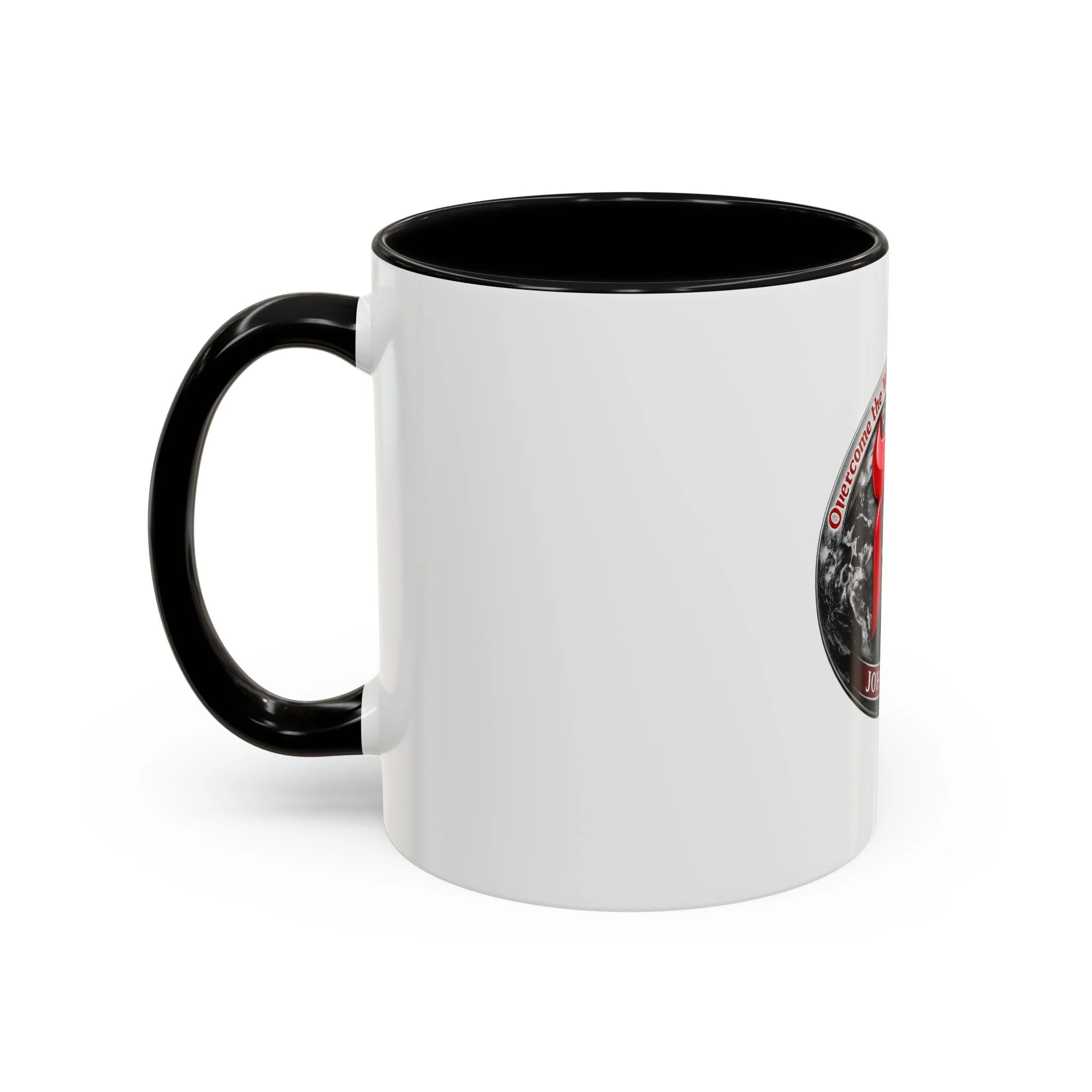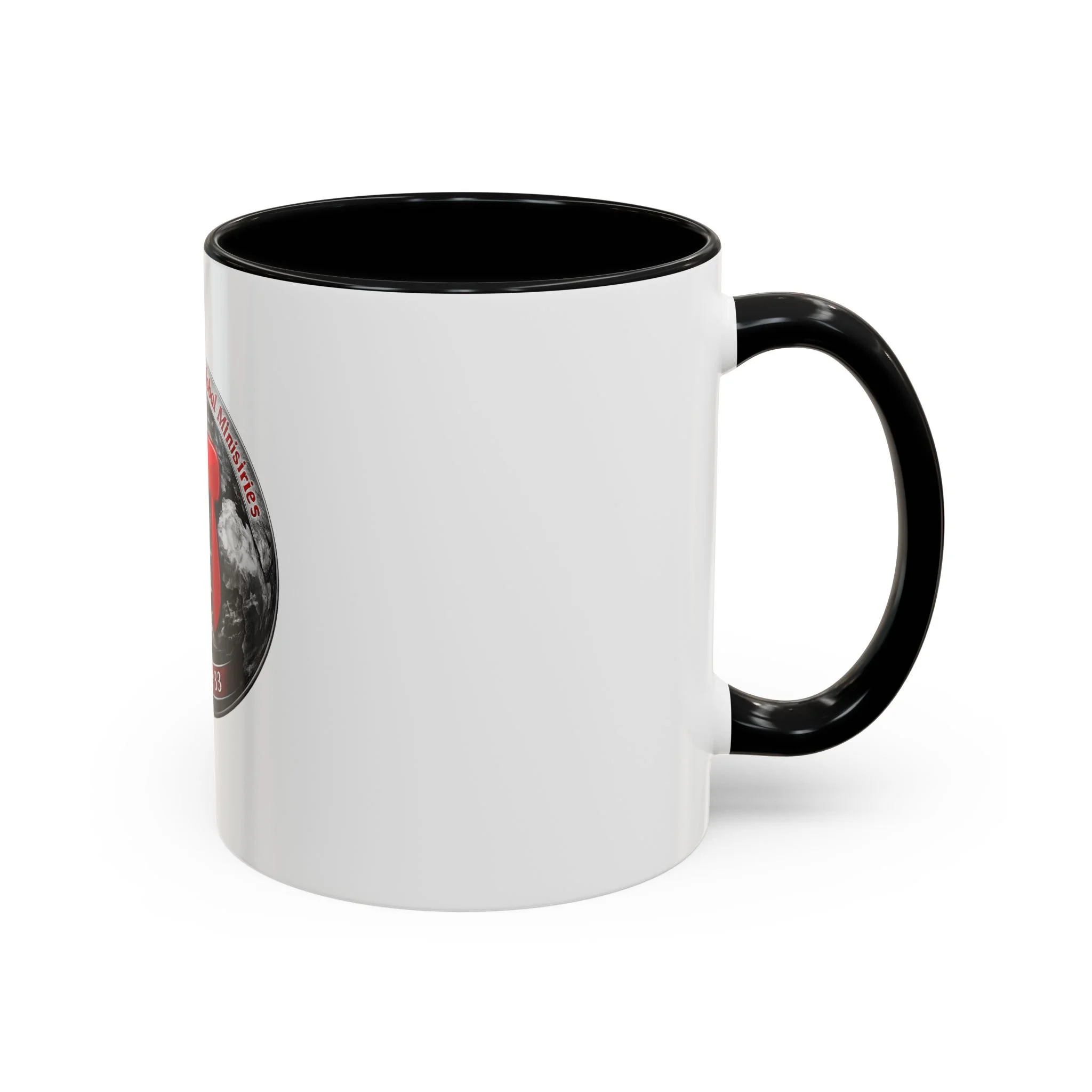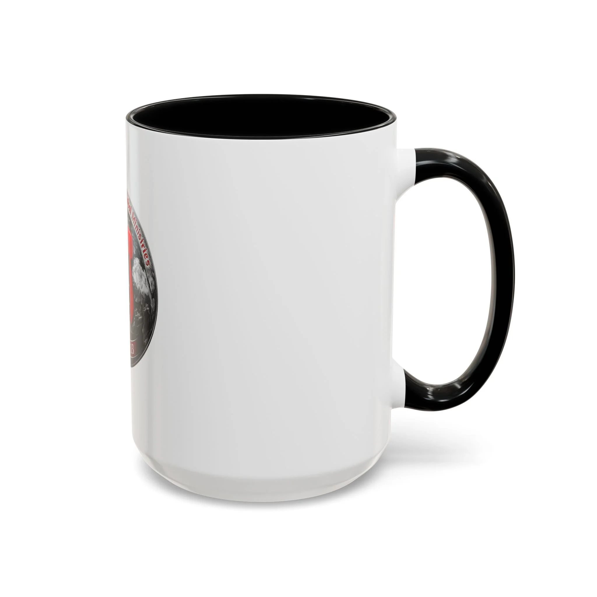 A bold ceramic mug that speaks to conviction and quiet mornings of reflection. The white glossy body contrasts with a rich black interior and handle, framing a striking circular emblem: a red Hebrew character layered over a grayscale globe, with the scripture reference John 16:33 arched beneath. It feels like a morning anchor — the kind of cup you reach for while reading devotionals, planning outreach, or pausing to steady your breath before a busy day. The vibrant print keeps the emblem sharp, and the sturdy C-handle sits comfortably in hand as you sip coffee or tea. Durable enough for daily use, it stands up to the microwave and dishwasher so the message stays part of your routine without fuss.